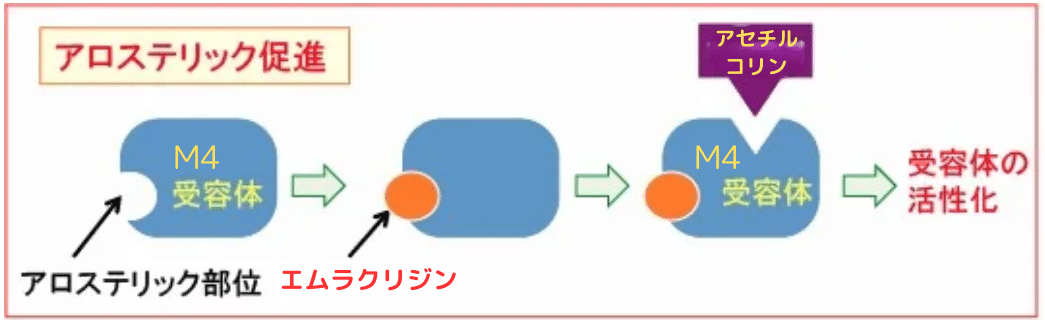 一方、エムラクリジンなどのアロステリック作動薬は、M4受容体(ムスカリン性アセチルコリンM4受容体)のアロステリック部位(別の部位)に結合する。その事で、アセチルコリンに対する感受性を上げる形で間接的に、ムスカリン性アセチルコリン受容体を刺激、活性化する。