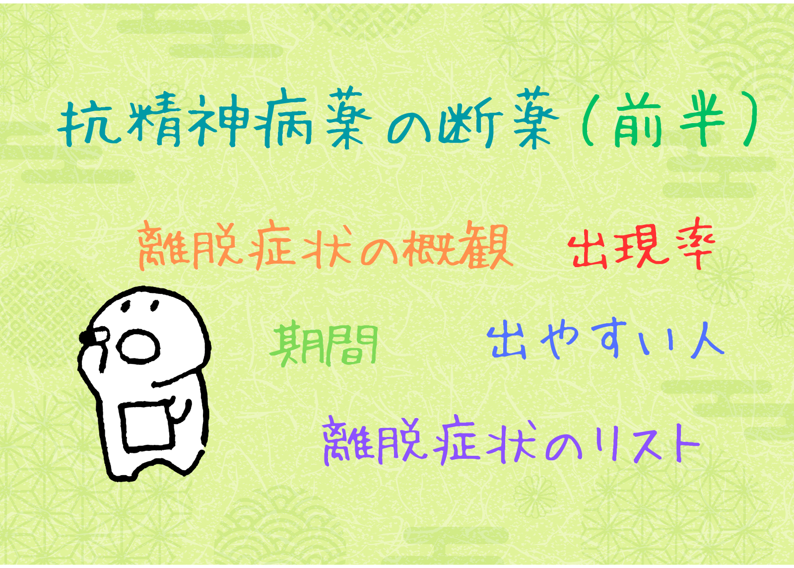 この記事や次の記事の結論を先に言うと、抗精神病薬を断薬する時に離脱症状が酷くなってしまう人の場合、テーパリング(徐々に減らす)という方法で断薬すればいいと思う。