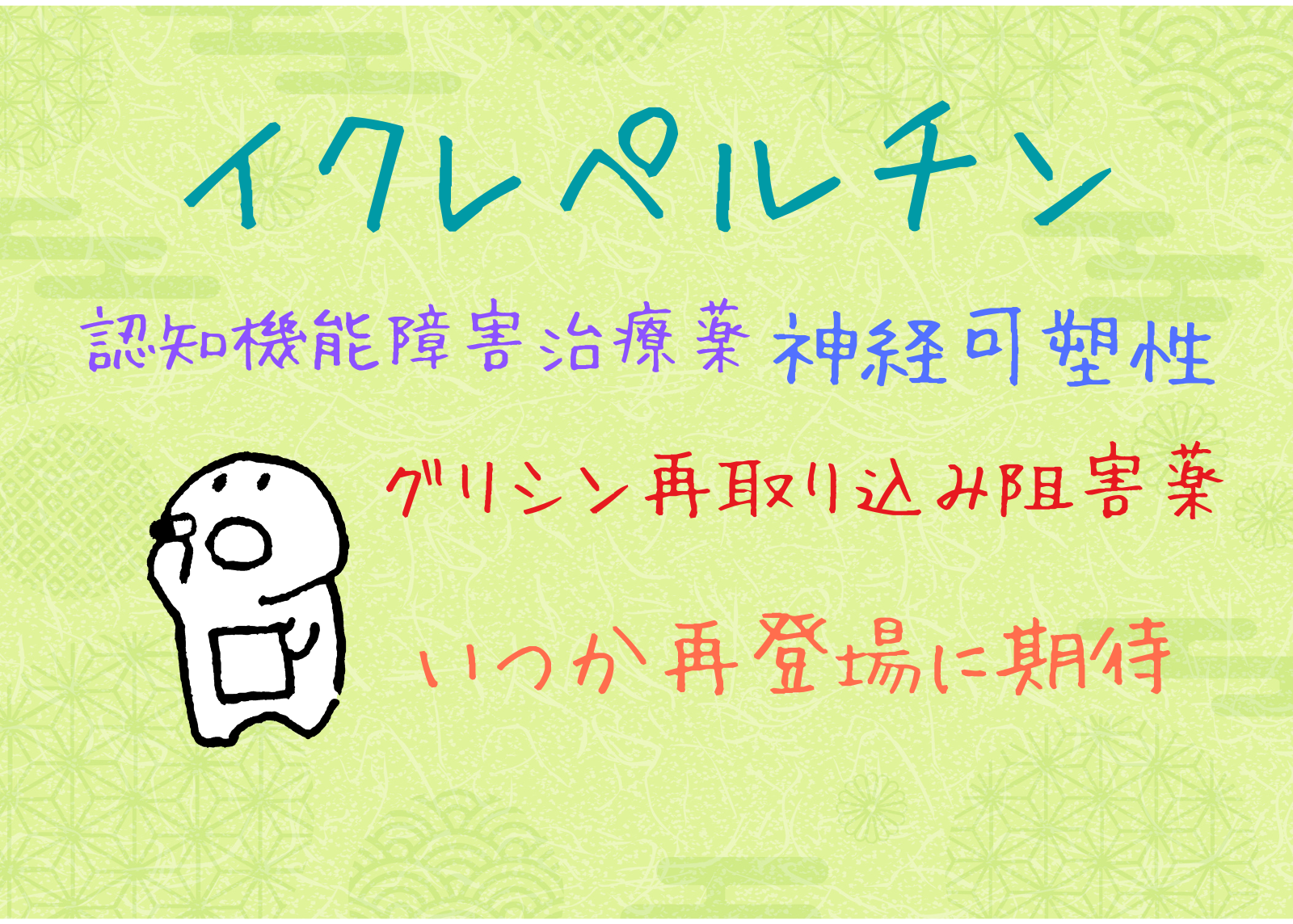 2025.1.21追記:イクレペルチンのフェーズ3試験は失敗しました。大変残念ですが、開発中止になるらしいです。認知機能障害については、コベンフィに期待するしかないです。