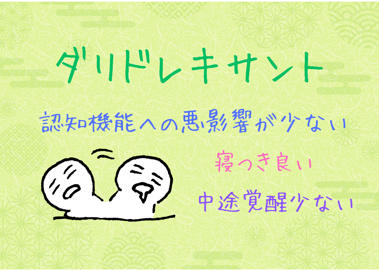 ダリドレキサントは、半減期が長くないので、翌日への持ち越し効果が少なく、認知機能への悪影響が少ない。